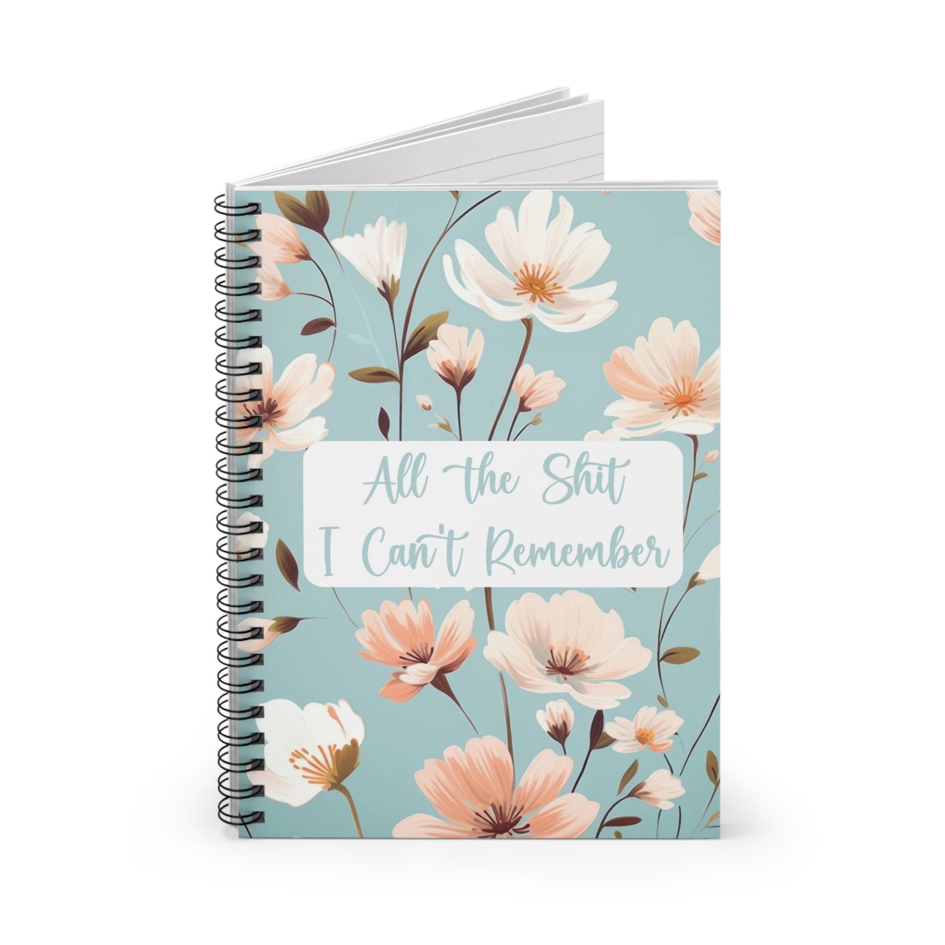 A funny spiral notebook featuring the phrase 'All the Sh*t I Can't Remember'. Perfect for jotting down notes, journaling, or keeping track of tasks. Ideal for college students, professionals, and anyone with a sense of humor. This notebook is relevant for back-to-school season, office gift exchanges, and birthdays.